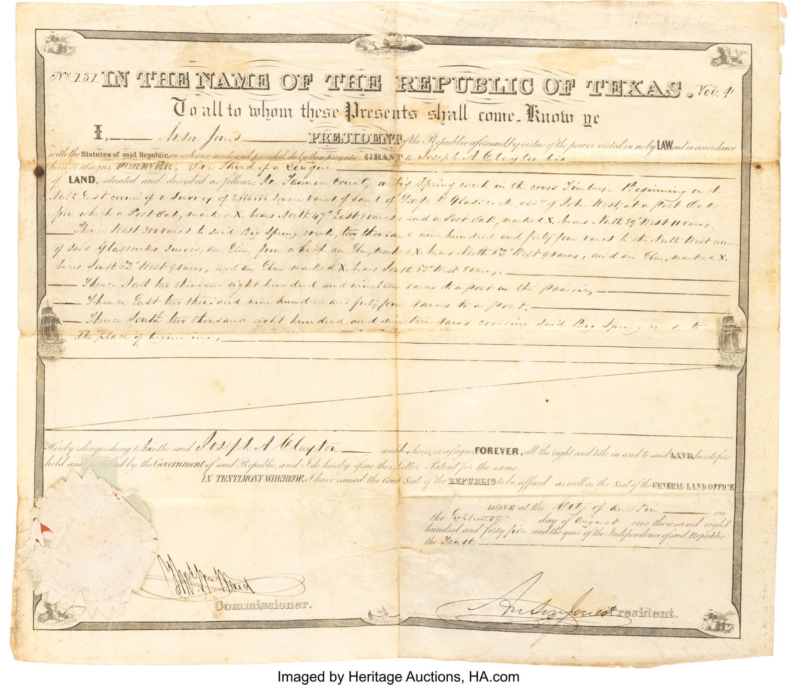 1801 New York Mayors Court Manuscript BailMirabeau Lamar Signed Land Grant. One partially4 days LeftStephen F. Austin Signed Texian Loan Certificate4 days LeftMassachusetts Civil War Appointments, Furlough etcMar 02, 2026TEMPLE HOUSTON (SAM HOUSTON'S SON) SIGNED $1500 BONDMar 18, 2026Andrew Jackson Signed Endorsement on Creek Indian / Alabama Document3 days LeftFoster Meekins 5th Sgt. 34th Mass appointmentMar 02, 2026Carolina Worn Out Kettle Document, Discharge, etc.Mar 02, 2026Elias R. Wightman Autograph Land Sale Document S4 days LeftZachary Taylor Appointment Signed as President.4 days LeftPhilip Dimmitt Autograph Document Signed, with a4 days Left[Republic of Texas]. City of Sabine Certificate4 days LeftCivil War Orders, Prisoner's Oath, Coffin order, etc.Mar 02, 2026State of New Hampshire – Militia Brigade Orders – War of 1812 Era Document – 18151850 NH Appointment Cpt James Webster RiflemanMar 02, 2026Ira Ingram Thrice Signed Printed Certificate for4 days Left