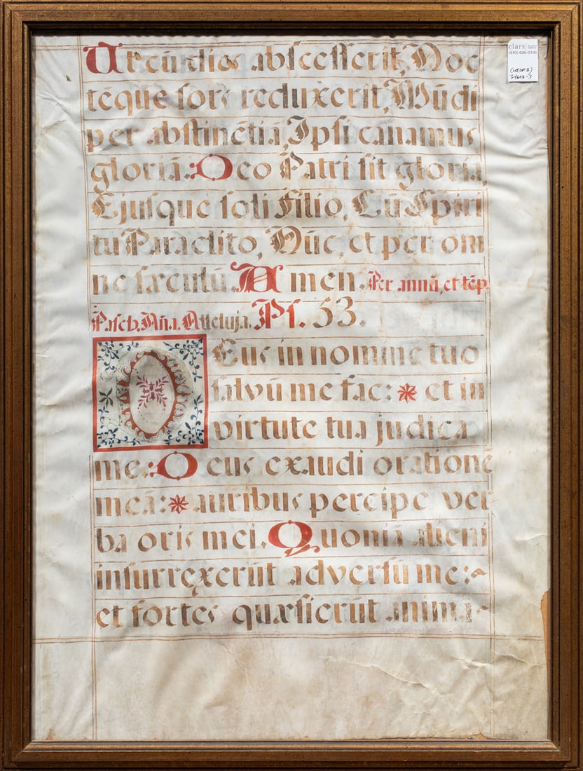Illuminated manuscript leaf from an antiphonal featuring Gregorian chant music and Latin text onRipley Auctions4.4(196)$10(1 bid)3 days Left