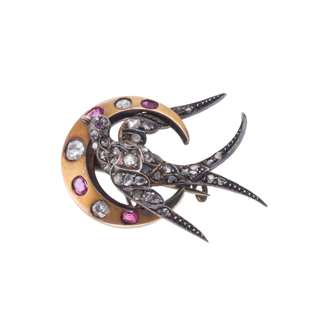 Antique 14k Gold Silver Diamond Ruby Swallow Bird Brooch
