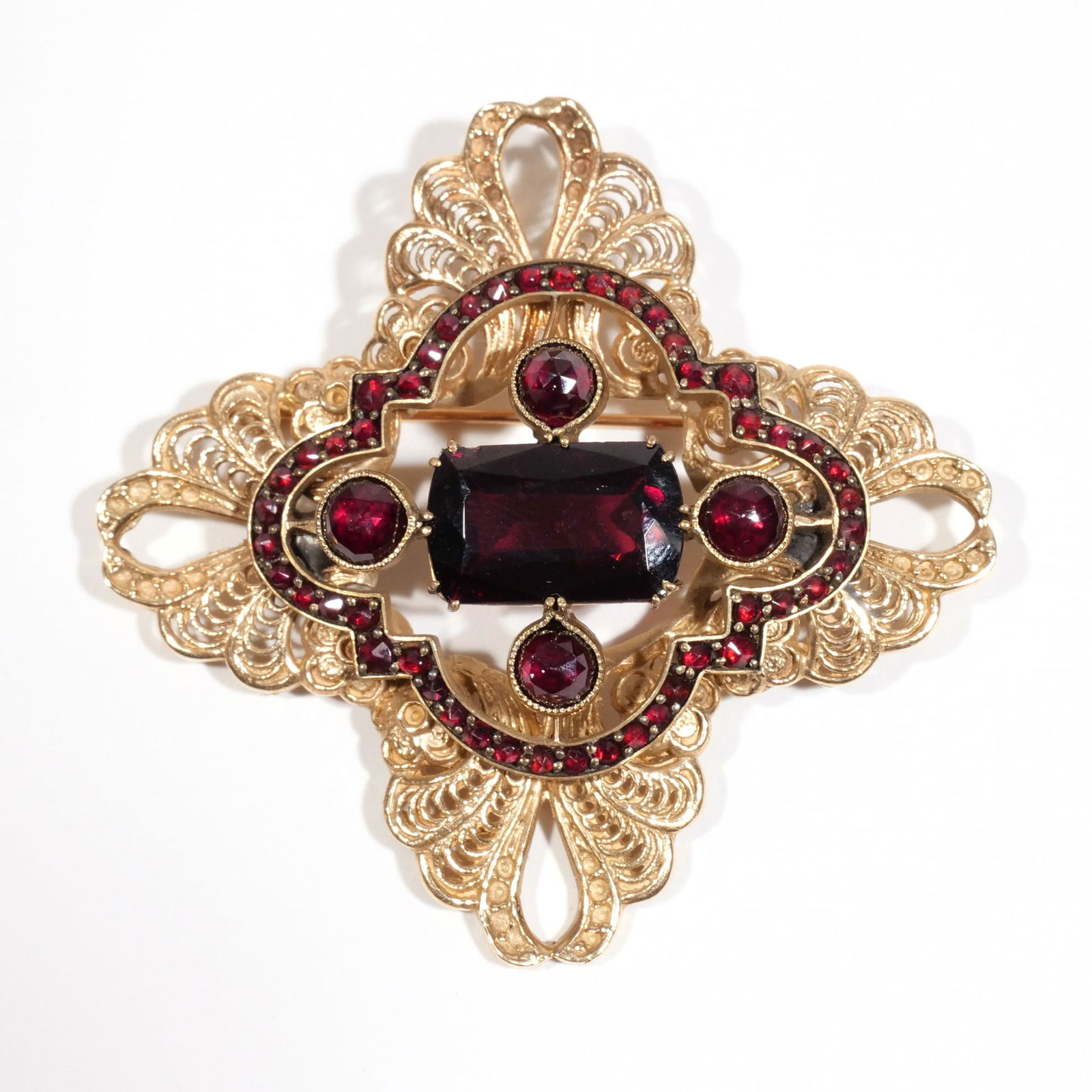 Vintage 14K gold garnet mounted pin. Concentric rings with floral decoration and 3 garnet cabochons.Tremont Auctions4.6(313)$275(2 bids)15 hrs Left