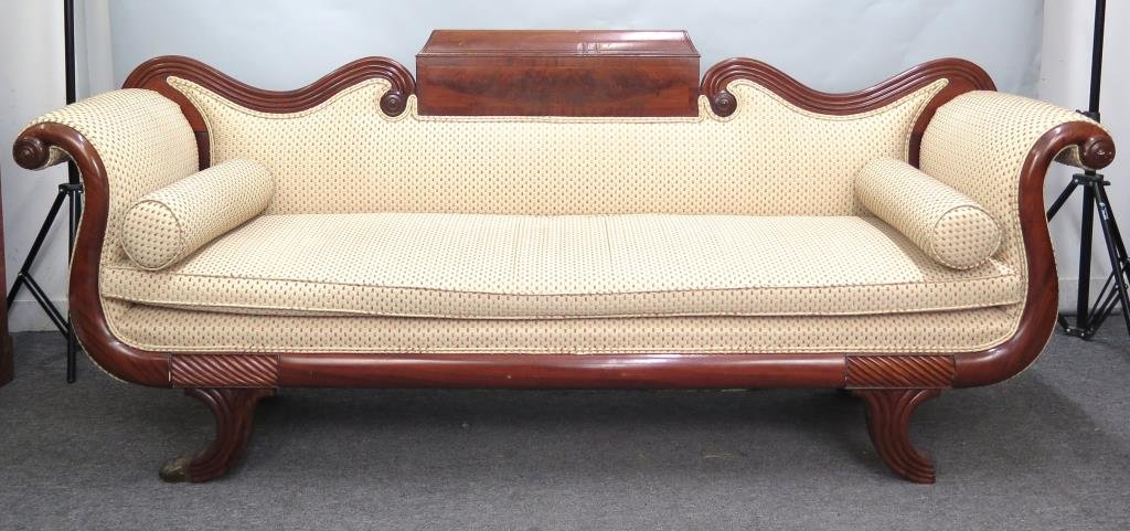 SoldAntique American Empire Custom Box Sofa / SetteeAntique American Empire Custom Upholstered Elegant Box Sofa / Settee. Upholstered in ivory. Hand carved with satin wood banded mahogany frame. Straight back and sides. On casters. 32 inches x 55 incheSee Sold Price