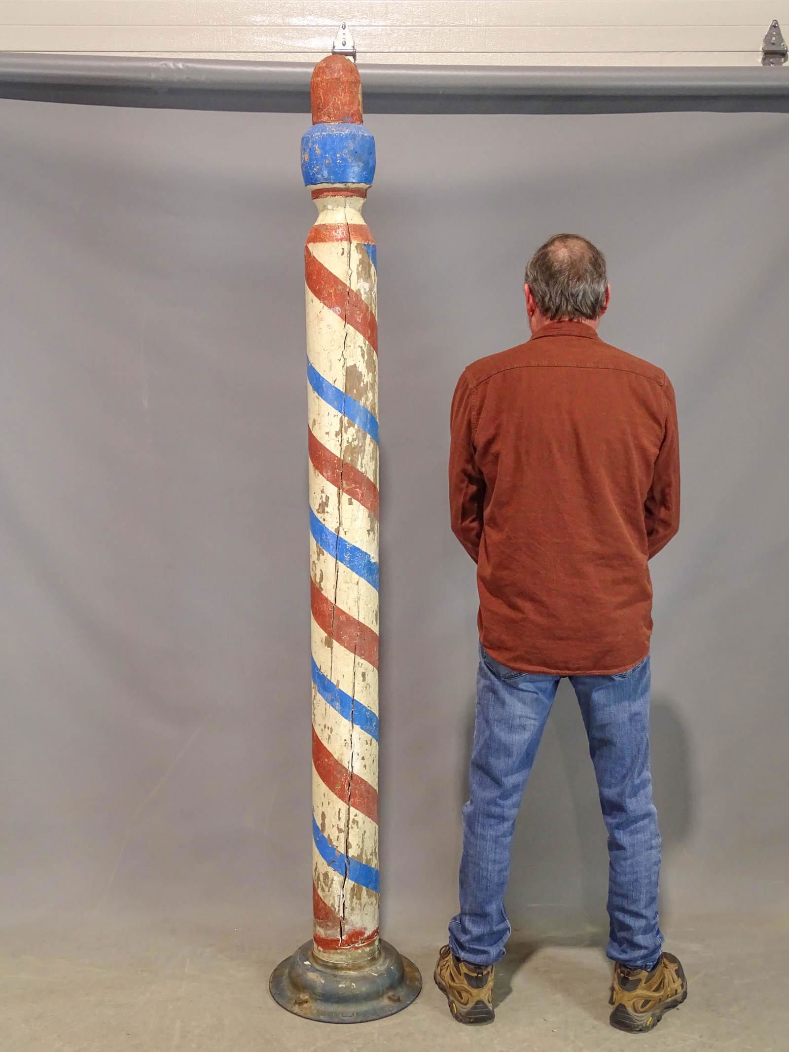 SoldAntique Carved Barber PolePainted barber's pole, red, white and blue stripes. Round base. Splits throughout. 79"h x 18" roundSee Sold Price