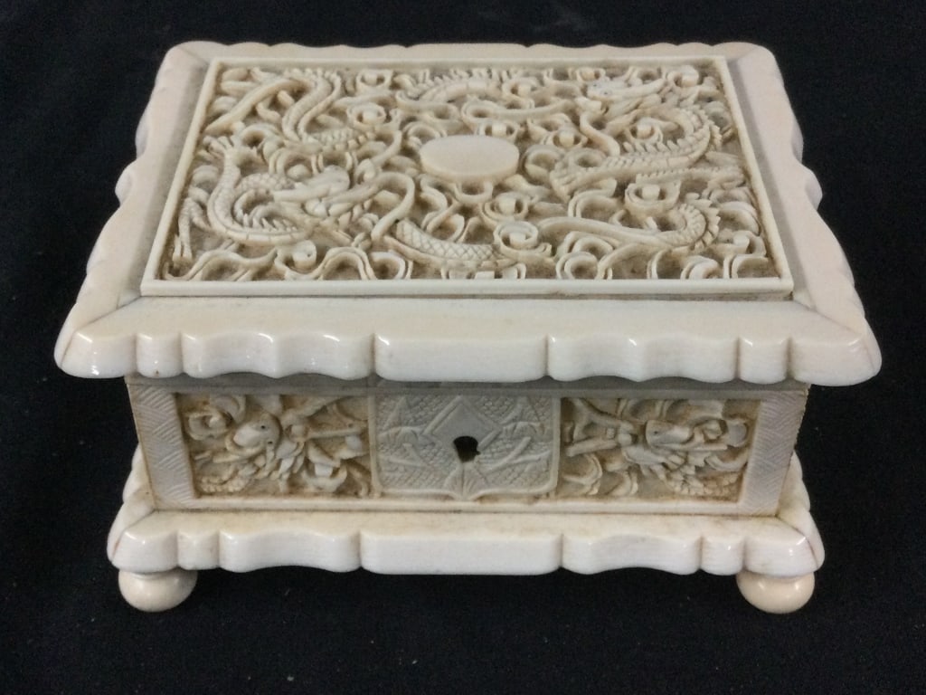 An old, antique rosewood box with copper-wrapped corners and exquisitely carved dragons presentingFreda4.3(1)€6009 hrs Left