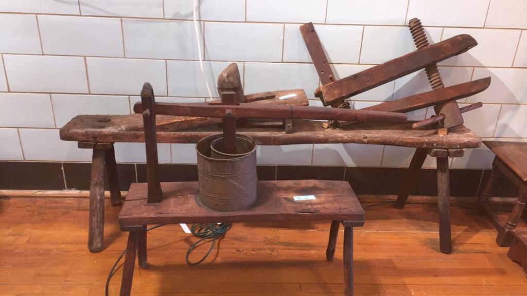 ANTIQUE BENCH W/ PRESS, WORKBENCH/ CLAMPS