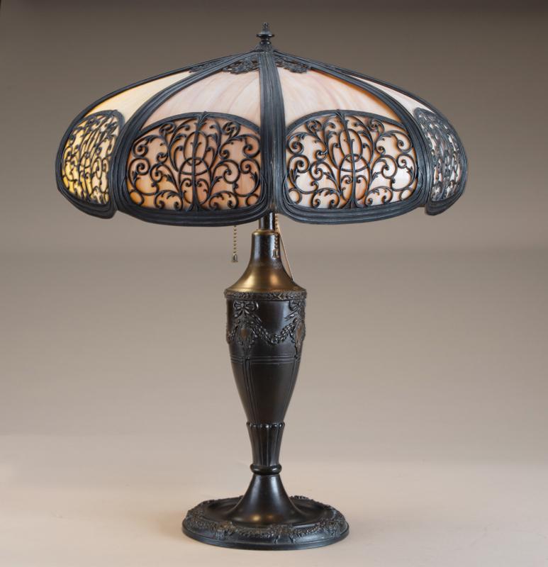 Antique bent panel, slag glass Table Lamp, circa