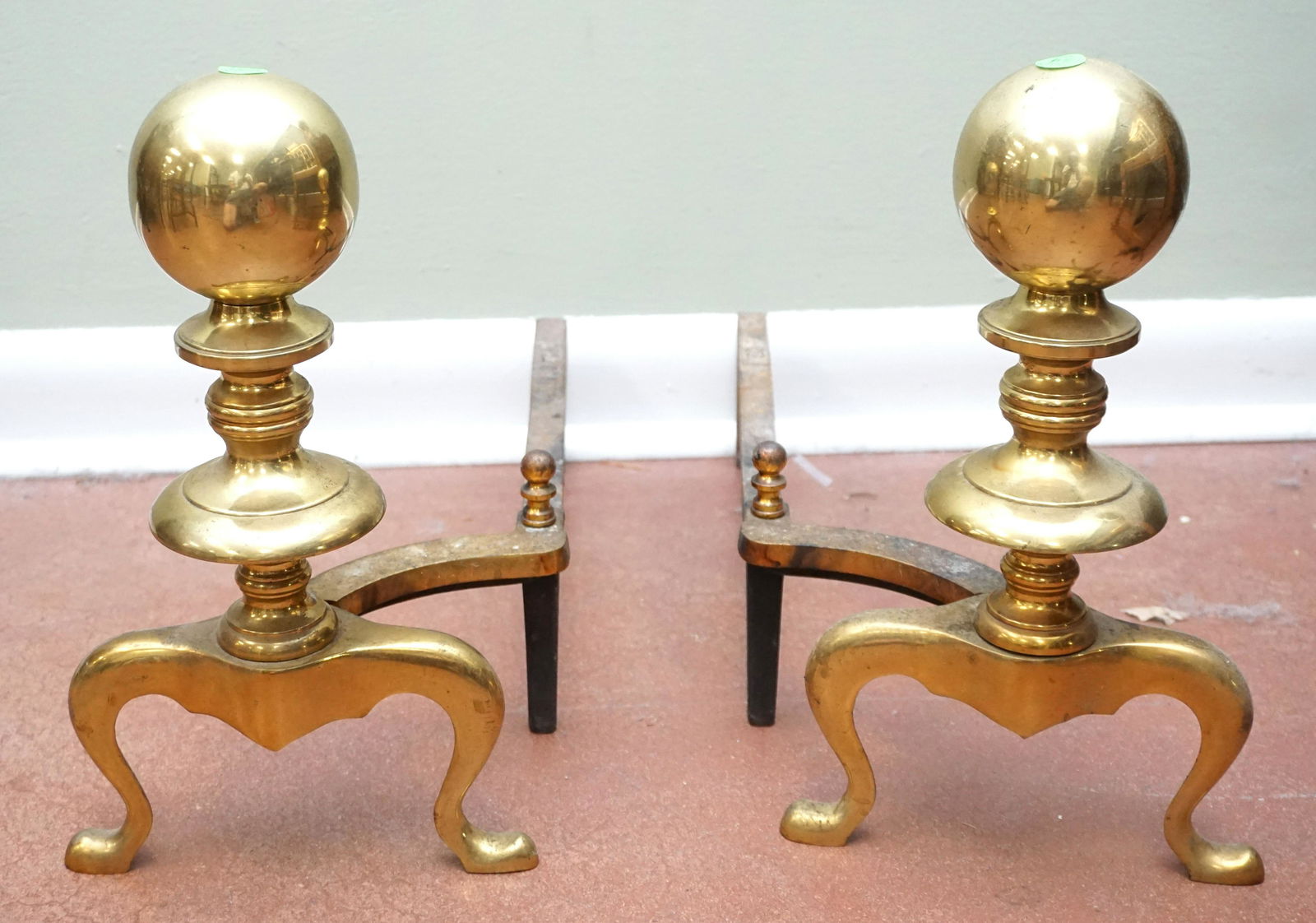ANTIQUE BRASS CANNONBALL ANDIRONS
