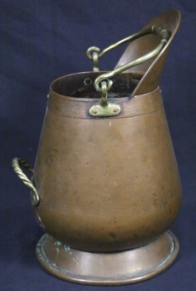 Sold19th c. DUTCH COPPER COAL SCUTTLE19th c. Antique Dutch Copper & Brass Coal Scuttle. Copper Bucket, Brass Foot, Brass figural Lion Head sides on the handle. Measures 14x10.50x12". Weight is 5 pds 1 oz. PROVENANCE: A Washington DC / ChSee Sold Price