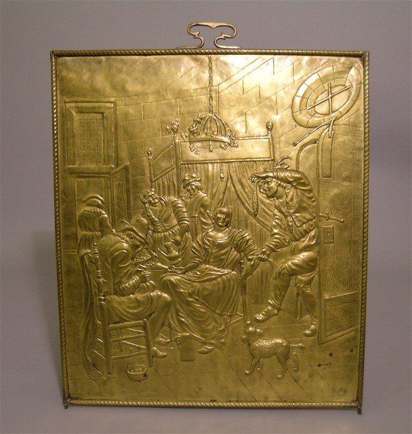 SoldAntique Embossed Brass Tavern-Scene Fire ScreenAntique Embossed Brass Tavern-Scene Fire Screen on Scrolled Feet - A handsome late 19th-early 20th century repousse brass fire screen, the central panel richly embossed with a lively tavern interior,See Sold Price
