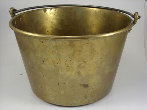 SoldBrass riveted bucket with swing handle, 13"hBrass riveted bucket with swing handle, 13"hSee Sold Price