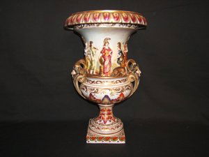 SoldLarge Naples Capodimonte Lidded Handled Urn. Figural decoration.Large Naples Capodimonte Lidded Handled Urn. Figural decoration. Dimensions: Height: 25 inches, Width: 16 inches, Depth: 11 inches. ---See Sold Price