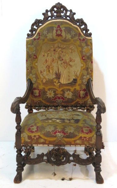 ANTIQUE CARVED HIGHBACK NEEDLEPOINT CHAIR