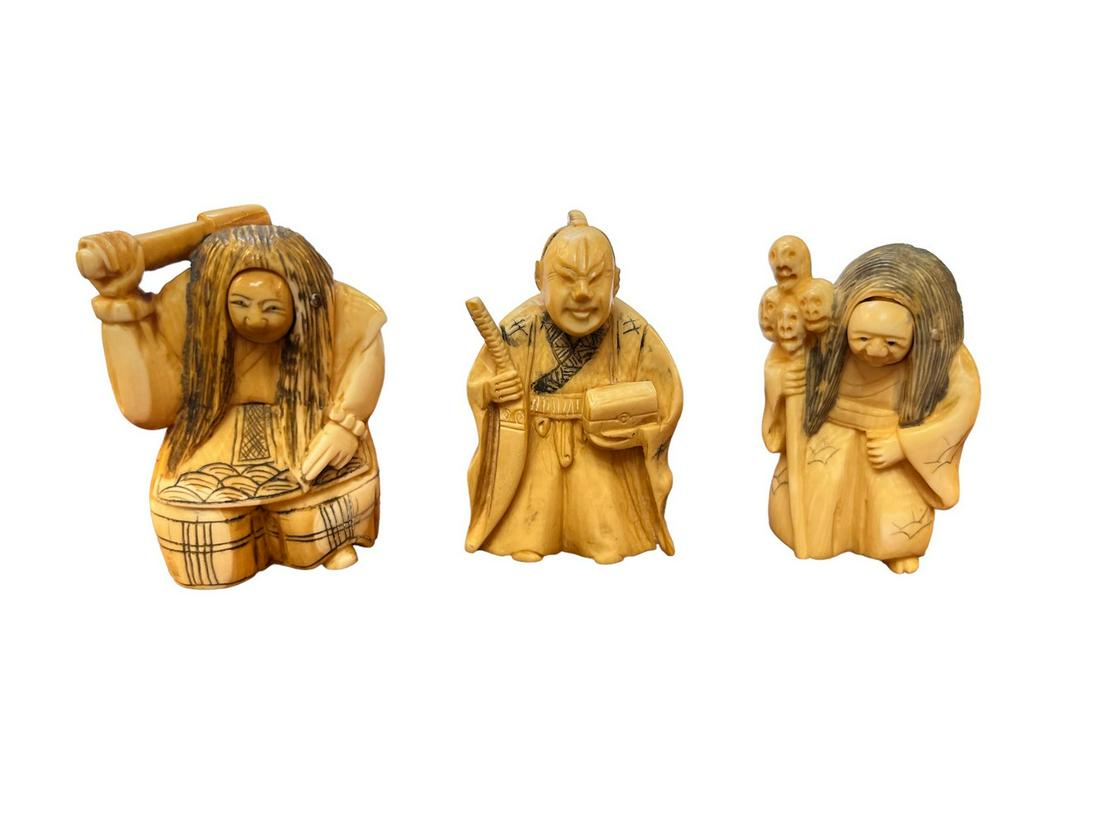 SoldThree (3) Chinese Antique Ivory Netsuke & Hair BrushThree (3) Chinese Antique Carved Ivory Netsuke & Hair Brush: African ivory, of 19th Century, NO INTERNATIONAL SHIPPING OF IVORY ITEMS; Size: L: 8-3/4" (biggest)See Sold Price