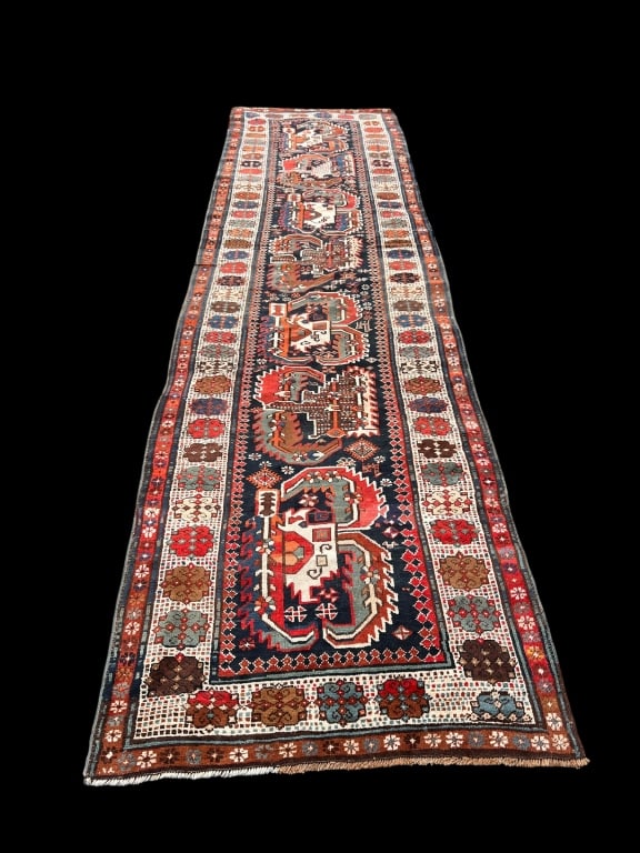 SoldCAUCASIAN KAZAK HANDWOVEN WOOL RUNNERCAUCASIAN KAZAK HANDWOVEN WOOL RUNNER, C. 1890, W 3' 9", L 12' 3" Scarce antique carpet with good color and bold geometric design.See Sold Price