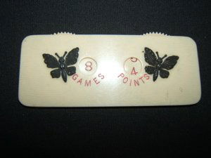SoldJAPANESE VINTAGE WOODEN CARD GAME SCORE COUNTERSThe lot includes: 1. A vintage wooden playing cards WHIST game scorer marker or counter register. 2. A vintage wooden Bezique card game score points counter. 3. A 1930's Japanese lacquered zitan woodSee Sold Price
