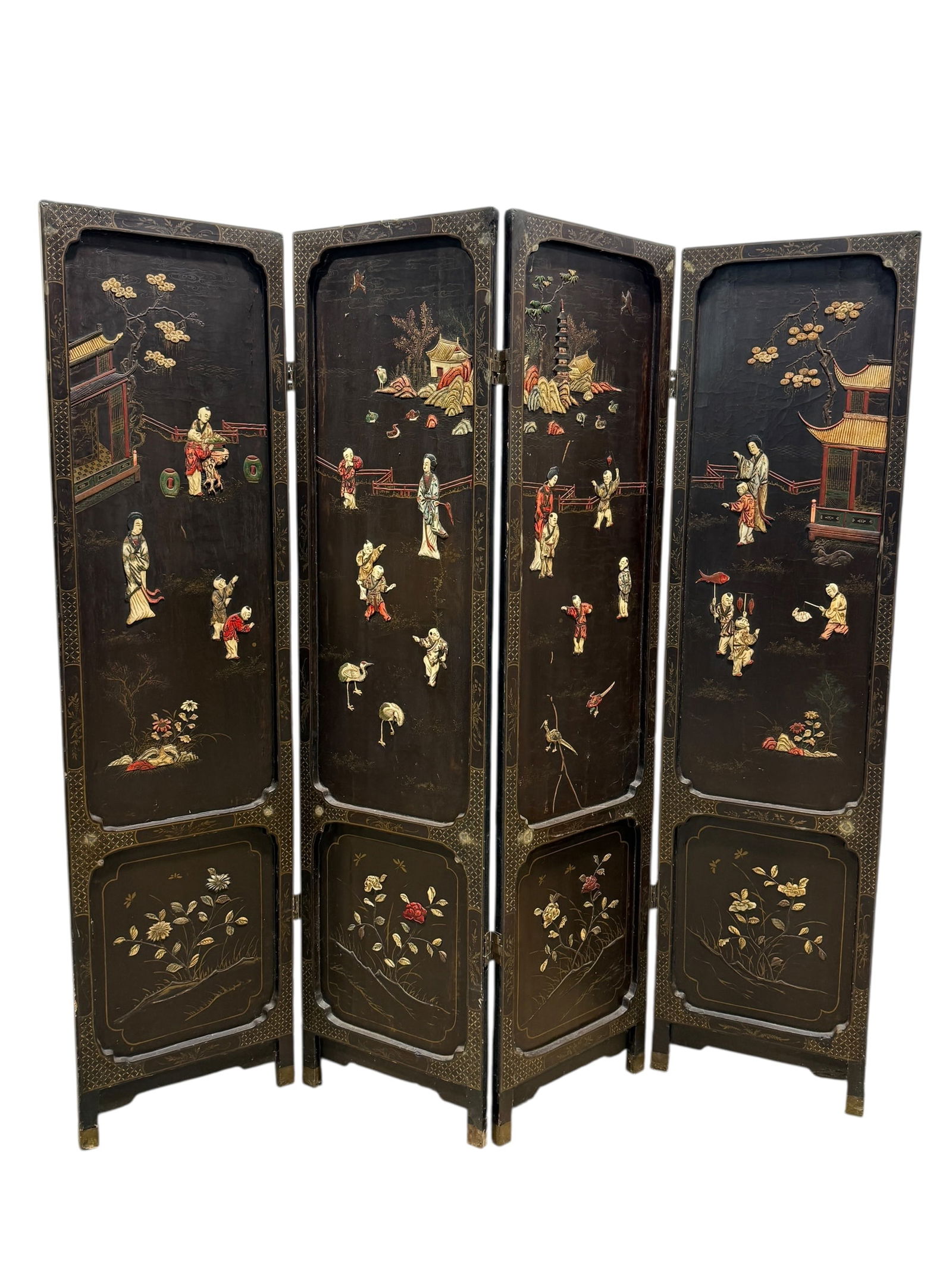 Antique Chinese Bone Inlay 4 Panel Screen
