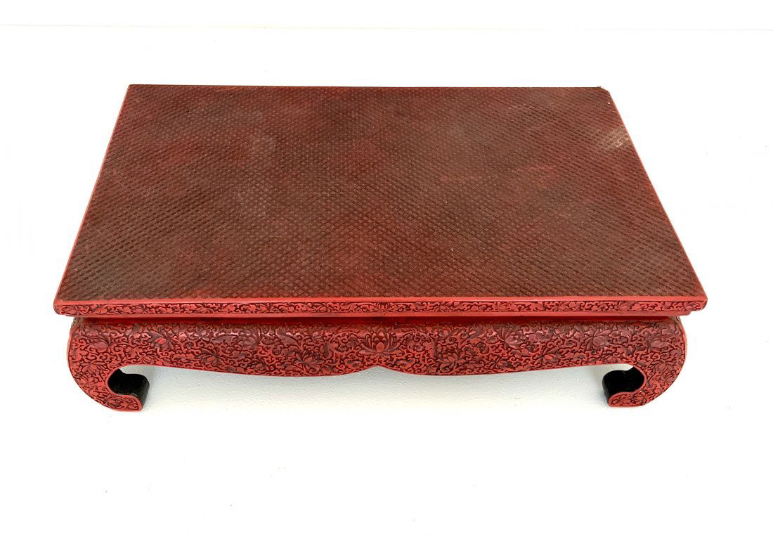 SoldANTIQUE rare cinnabar wood low table, Qing period. 21 1/2" x 12 1/2" x 5 1/4" highANTIQUE rare cinnabar wood low table, Qing period. 21 1/2" x 12 1/2" x 5 1/4" highSee Sold Price