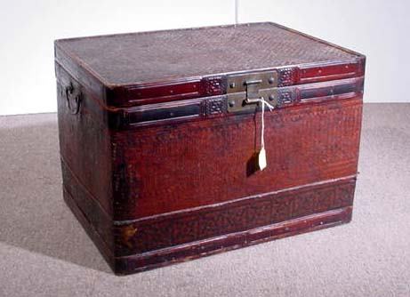 ANTIQUE CHINESE DECORATED RECTANGULAR RATTAN TRAVE