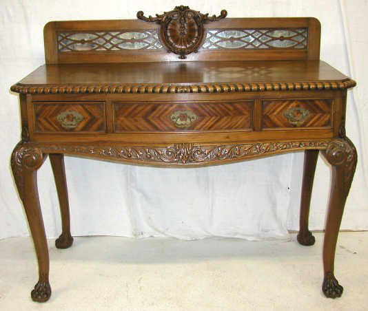 SoldANTIQUE CLAW FOOT SERVER ATTR RJ HORNERCarved wood. On casters. Brass hardware. 2 dovetailed drawers. Carved backsplash. 51 1/2" h x 49 1/4" w x 22 1/2" d.See Sold Price