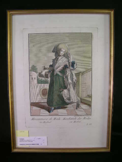ANTIQUE COLORED ETCHING MERCANTESS A DI MODE