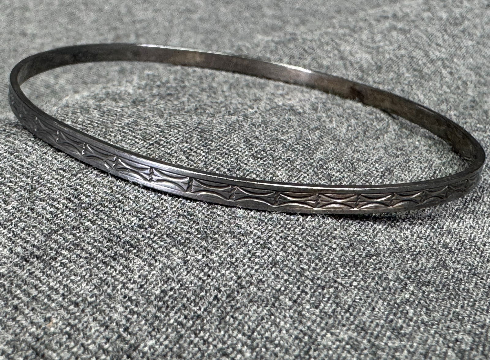 SoldAntique Sterling Silver Chased Bangle BraceletAntique Sterling Silver Chased Bangle Bracelet. Measures 2.5 inches across the interior opening.See Sold Price