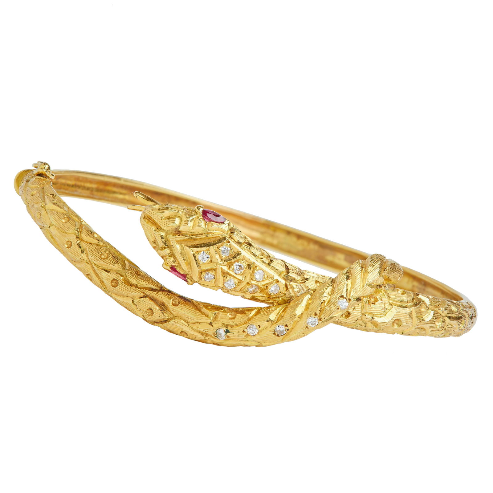 AN ANTIQUE VICTORIAN SAPPHIRE, GEMSTONE AND DIAMOND SNAKE BANGLE in yellow gold, designed as two coiAN ANTIQUE VICTORIAN SAPPHIRE, GEMSTONE AND DIAMOND SNAKE BANGLE in yellow gold, designed as two coiled snakes, one snake's head set with a cushion cut red stone in a surround of rose cut diamonds, th