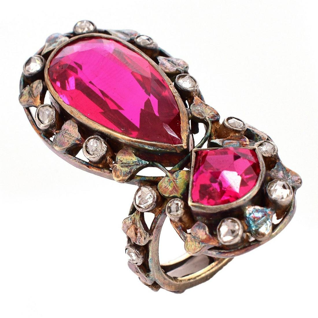SoldAntique Diamond Man Made Ruby, Silver & Gold RingAntique Rose Cut Diamond, Man Made Ruby and Silver Topped Yellow Gold Ring. Unsigned. Good antique condition. Ring size 4-1/4. Approx. weight: 10.3 grams. Condition: Very Good Estimate: $400.00 - $600See Sold Price