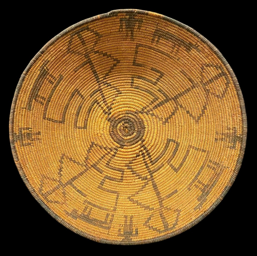 SoldLarge Antique Apache BasketOffered here for your consideration is a large antique Apache basket. This beautiful basket is decorated with a great whirlwind pattern. It also features a blue bead attached to a wire in the back, maSee Sold Price