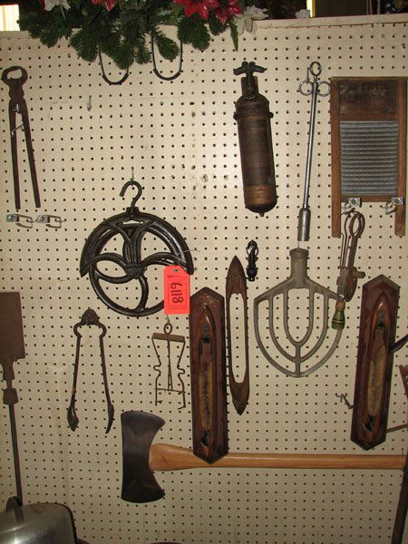 ANTIQUE FIRE EXTINGUISHER, SMALL WASHBOARD, PULLE