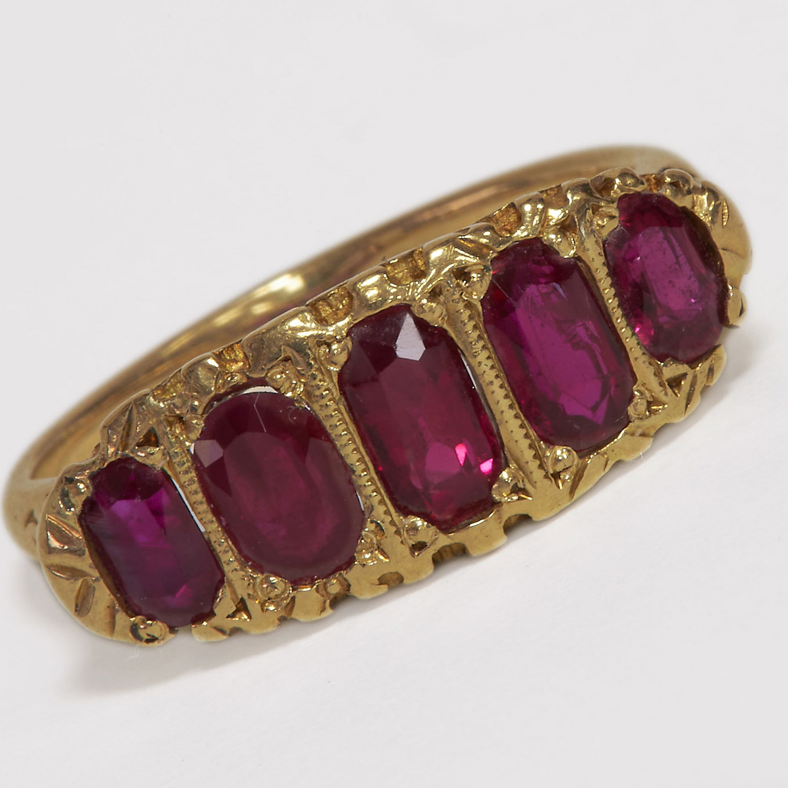 ANTIQUE FIVE STONE RUBY RING.
