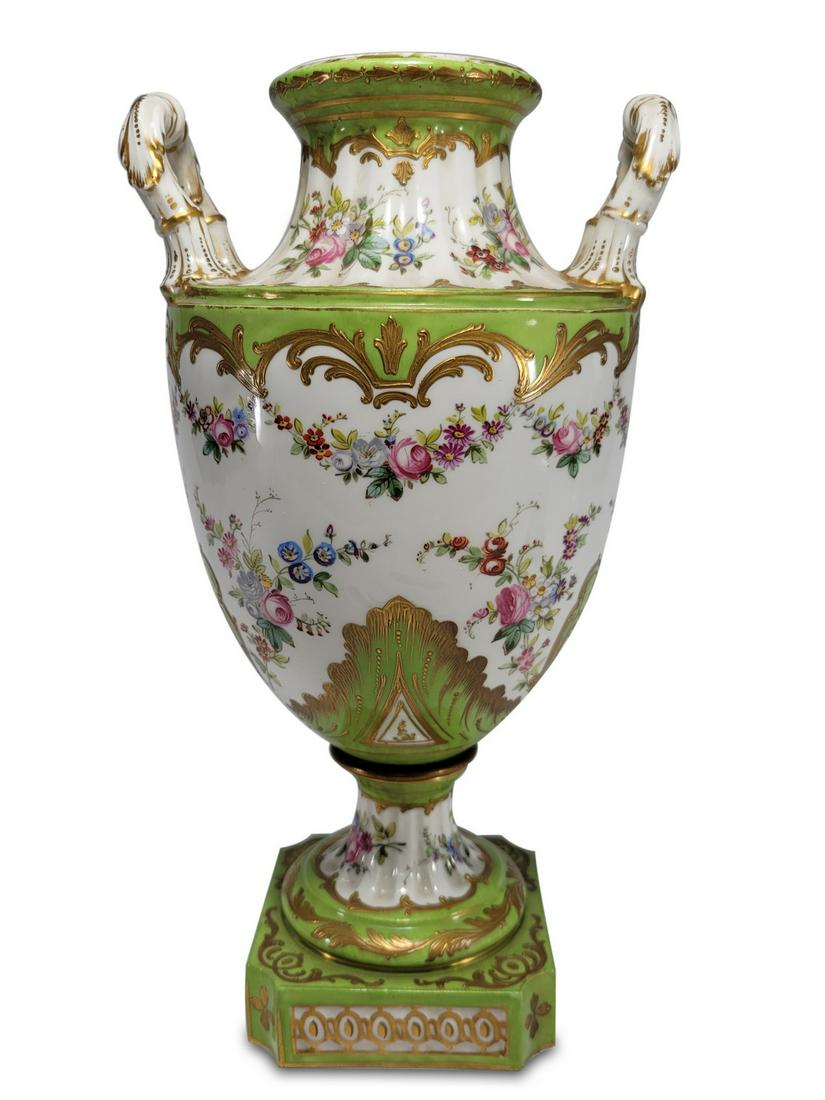 SoldLarge Antique French Sevres Porcelain UrnDESCRIPTION: Large Antique French Sevres Porcelain Urn with ormolu handles and a bronze cap with a swirling foliate top finishing with an acorn finial. The front of the urn painted with a cartouche suSee Sold Price