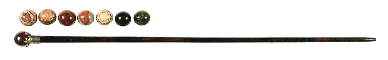 ANTIQUE GADGET CANE WITH 8 INTERCHANGEABLE HANDLES.