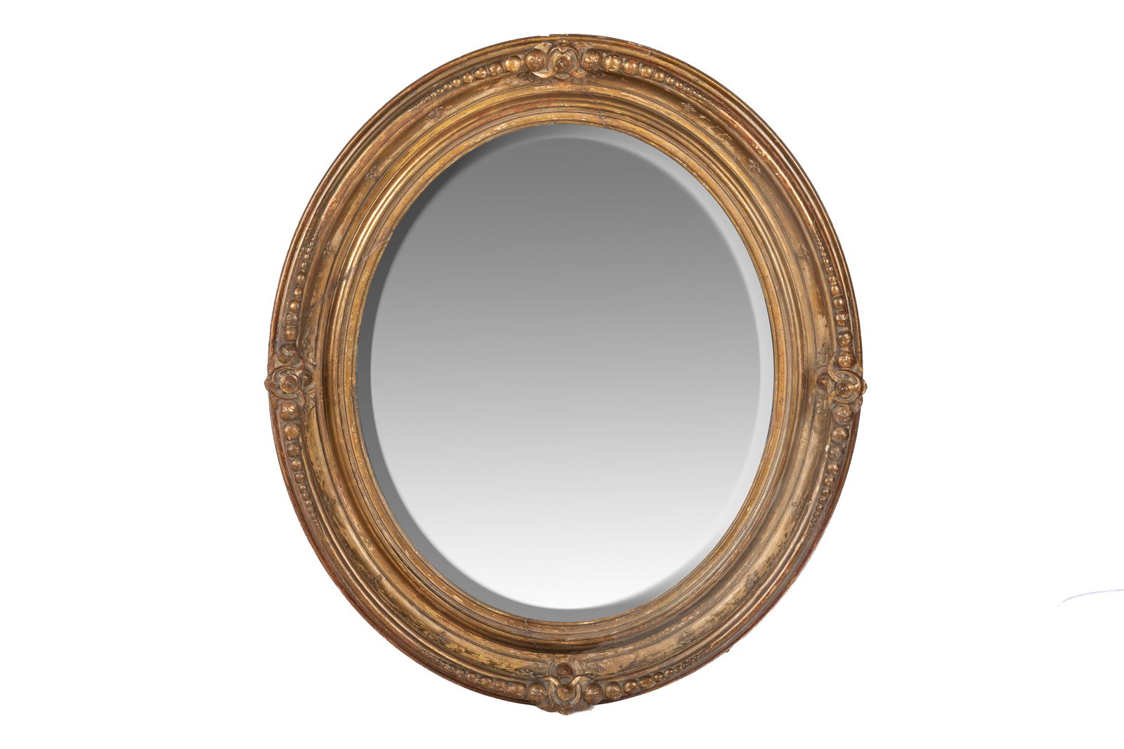 SoldANTIQUE GILT FRAMED OVAL MIRROR19th C with graduated beaded detail. H: 39" W: 34 1/2"See Sold Price