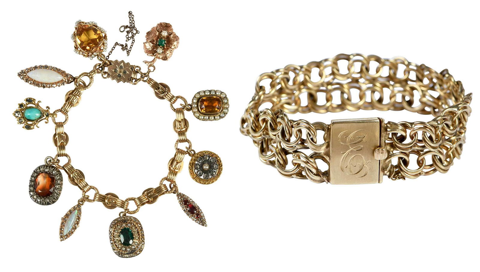 SLIDE CHARMS 14K BRACELET YELLOW GOLD VINTAGE MULTICOLOR GEMS SEED PEARLSModern Jewelry4.4(204)See Sold PriceJul 13, 2025