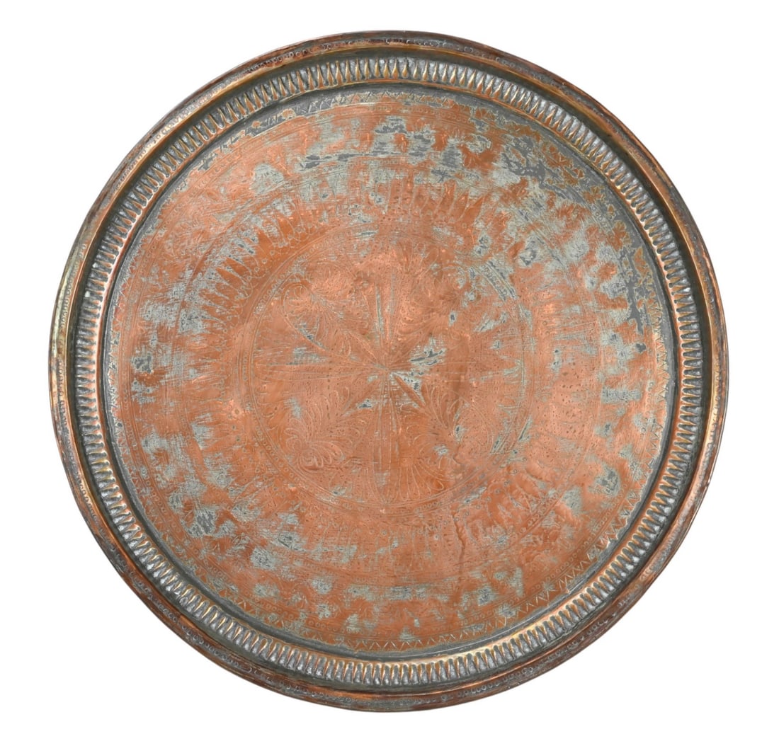 Antique Heavy Copper Engraved Circular Tray Top