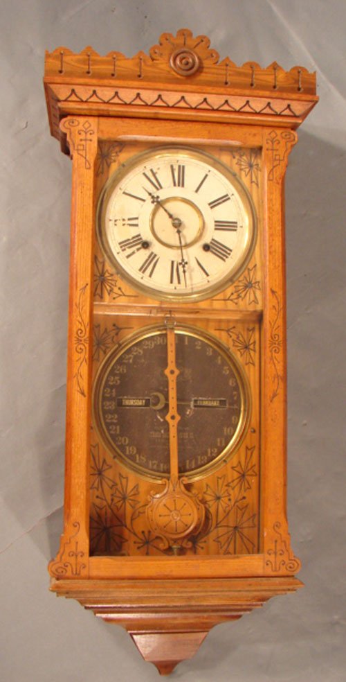 Antique Ithaca Hanging Oak Calendar Clock. In work