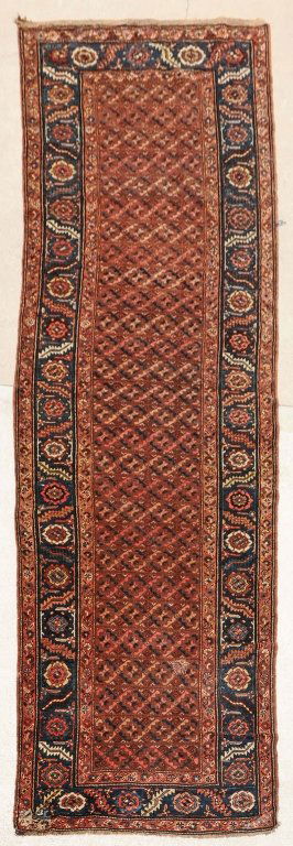 ANTIQUE KURDISH RUNNER. RUST BACKGROUND AND A BLUE