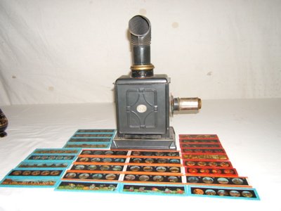 SoldAntique Magic Lantern and 150+ SlidesAn Antique magic lantern and more than 150 glass slides as seen in photograph preview. Dimensions: 16" X 9" X 5"See Sold Price