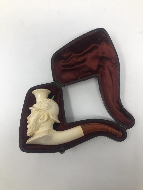 SoldANTIQUE MEERSCHAUM PIPE ROMAN HERORoman hero. Real amber stem. In case. Measurements are shipping measurements.See Sold Price
