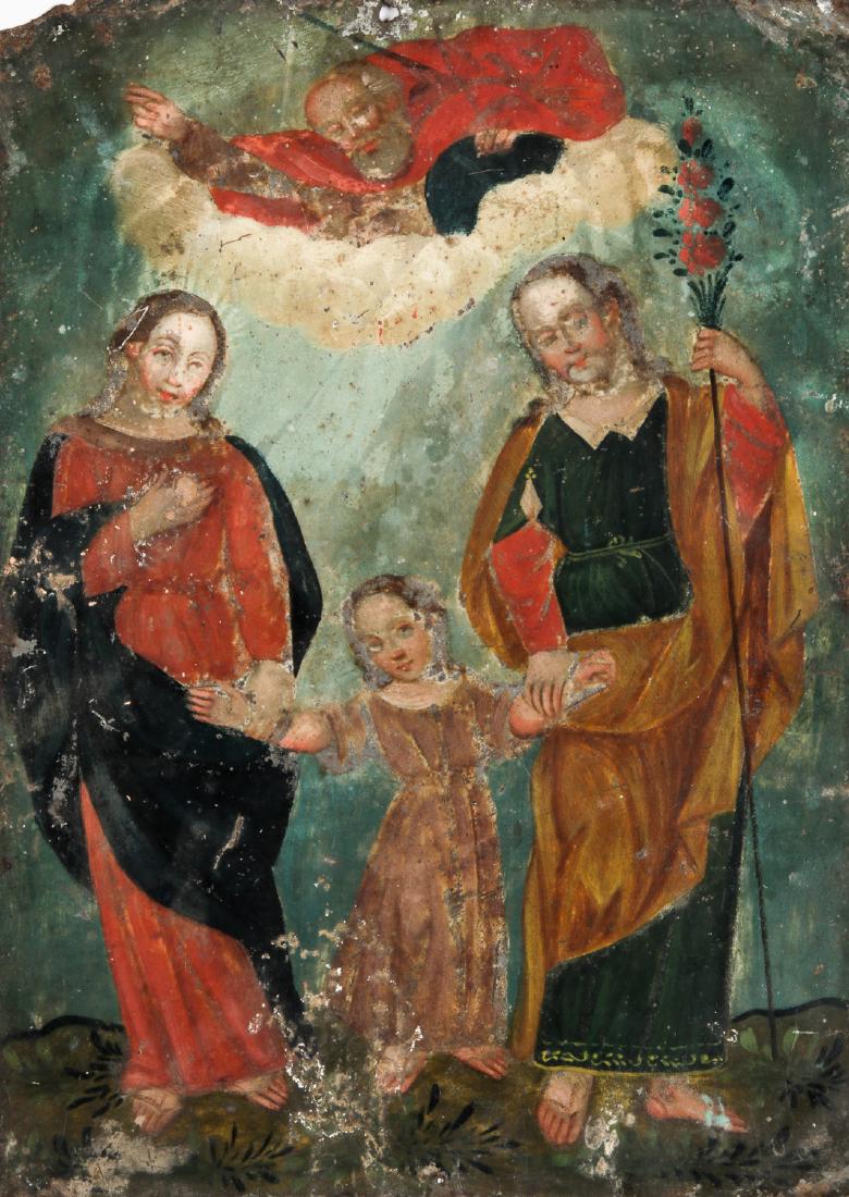 19th c. Mexican/Southwest Retablo Painting on Tin Sheet of Joseph, Mary & Baby Jesus & GodMark Louis Weseloh Estate Liquidations4.3(22)$2004 days Left