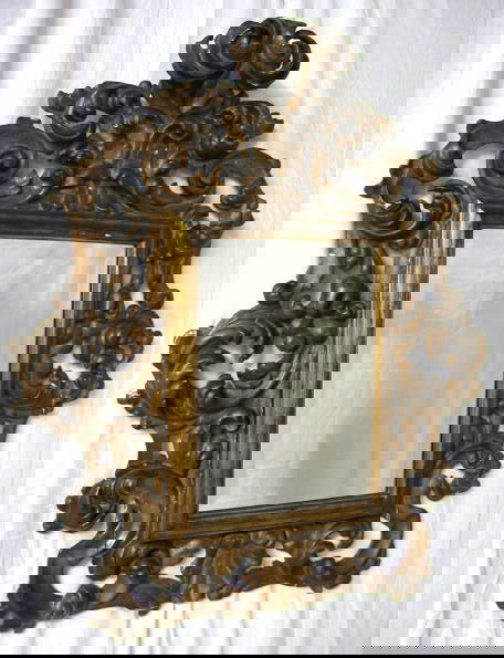 SoldFlorentine Carved Mirror19th C, beautiful antique mirror frame, gilded wood, with open work, very good condition, frame measures 32" x 29", mirror 16.5" x 13" Start Bid $800See Sold Price