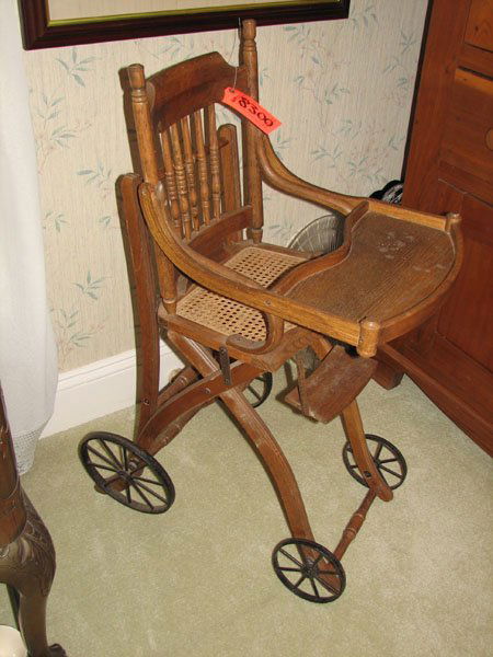 ANTIQUE OAK COLLAPSIBLE, REPOSITIONABLE HIGHCHAIR
