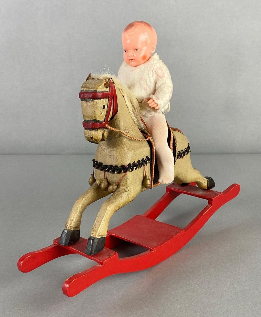Antique Wood Rocking Horse with Plastic Baby Doll