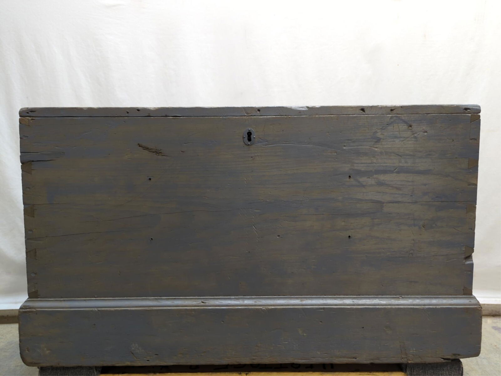 SoldPRIMITIVE PINE BLANKET CHESTPRIMITIVE PINE DOVETAILED BLANKET CHEST ON BRACKET FEET, BARK BLUE GRAIN FINISH, APPROXIMATELY 36 IN X 17 IN X 19 IN HSee Sold Price