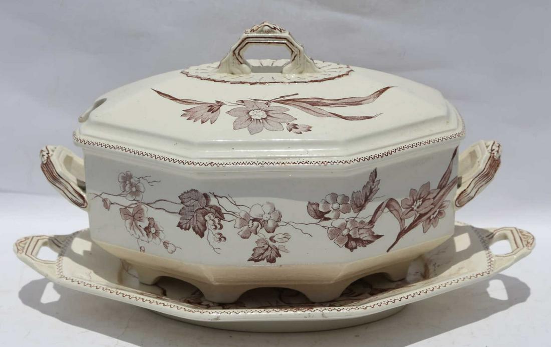 ANTIQUE RED COVERED VEGETABLE DISH WITH UNDERPLATE