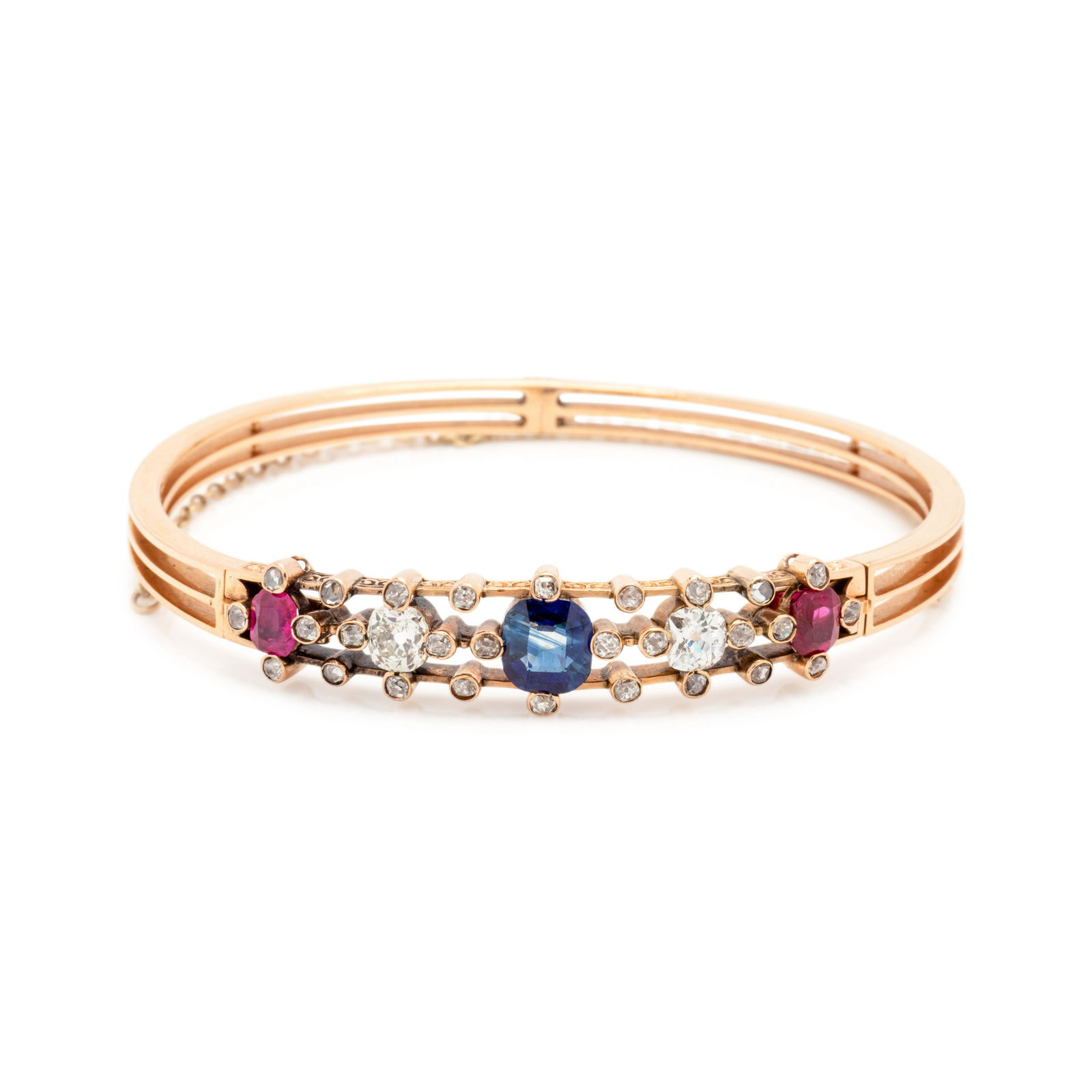 ANTIQUE, SAPPHIRE, DIAMOND AND RUBY BANGLE BRACELET