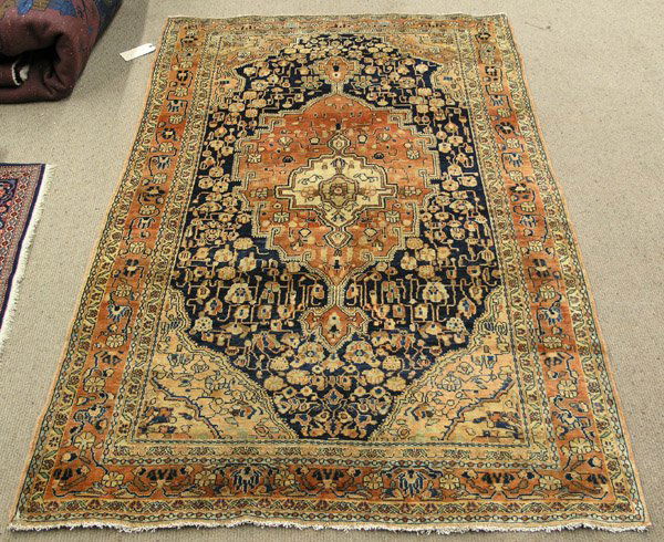 SoldAntique Fereghan Sarouk Wool Carpet Rug,Persia,Circa 1900 Navy blue center medallion with ivory and salmon red filed with tendril design surrounded by intricate floral border. Wool,4' 8' x 3' 5",See Sold Price