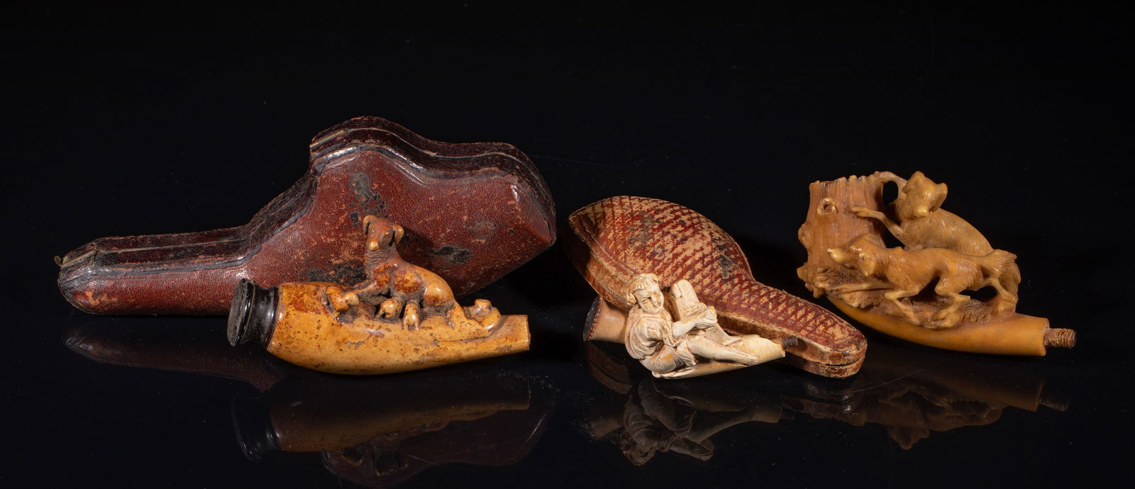 SoldPair of Antique Meerschaum Pipes w/ CasesLate 19th century, Turkish antique pipes with cases, included is a fabulous quality carving of a black "dandy" with hat, amber stem and case, the other appears to be a well carved figure of a civil waSee Sold Price
