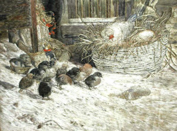 ANTIQUE SILK EMBROIDERY CHICKENS