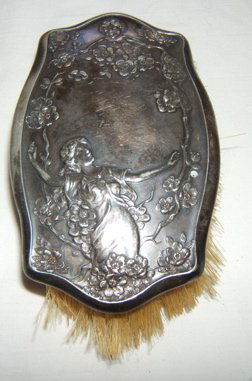 SoldVikki Carr | Antique Silverplate Vanity MirrorVictorian English (Sheffield) silver plate dressing table swivel mirror having chased vining grape motif border, wood back, trumpet brackets with scrolled branching candelabrum flanking ovular mirrorSee Sold Price