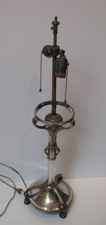 SoldART NOUVEAU SILVER PLATE FRUIT BASKET LAMPART NOUVEAU SILVER PLATE FRUIT BASKET LAMP WITH SILVER PLATE BASE SUPPORTING CZECH GLASS FRUIT CONSOLE LAMP 12" x 6" x 12"See Sold Price